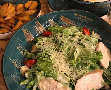 pollo salteado, con verduras de estación, queso parmesano y albaca